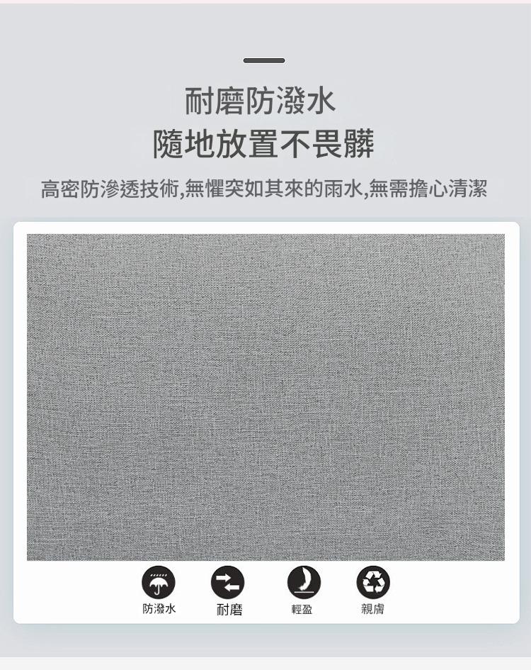 耐磨水牛津布料: 遇水呈珠不易滲透,耐磨防刮且防污好清理,輕輕一擦即亮潔如新。