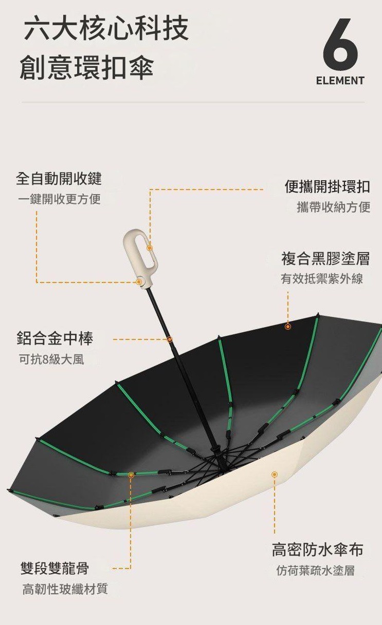 • 環扣手柄設計: 獨特登山扣式環扣柄,方便懸掛於背包、手提袋或車內,徹底解放雙手,不怕再忘了拿傘。