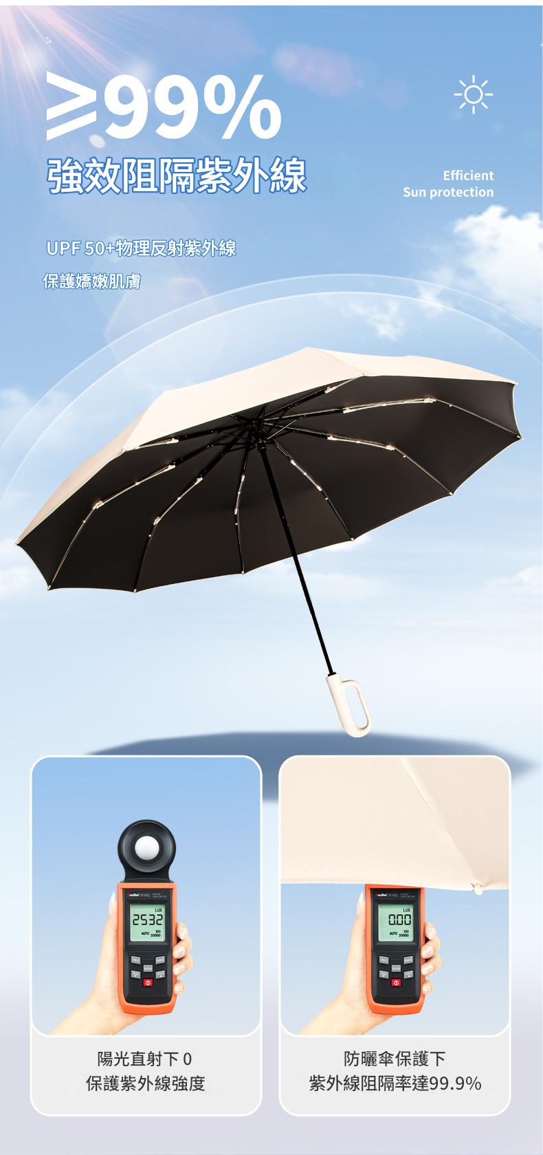 採用高品質加厚黑膠傘布,UPF50+ 極致物理防曬,強效阻隔 99.9% 紫外線!撐開傘的瞬間,體感溫度直接降溫,像躲進森林樹蔭下般清涼,不僅遮光更是在守護你的肌膚健康。